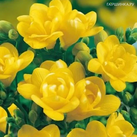 Фрезия Еллоу махровая — красивоцветущее клубнелуковичное растение, высотой до 40 см. Выращивать его можно как в саду, так и дома. Листья имеют поникающую мечевидную форму. Цветки махровые, воронковидные, желтые, диаметром до 6 см, собраны в кистевидные соцветия по 10–12 шт., продолжительность цветения до 10 дней.