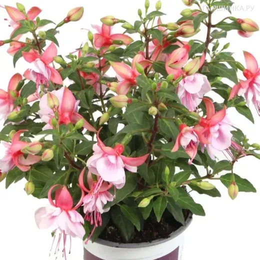 Фуксия Белла Бьянка - кустовая мелкоцветковая низкорослая фуксия. Цветёт обильно и долго. Цветки фуксии имеют розовые оттенки. Фуксия считается неприхотливым и красивоцветущим растением. Яркий свет или полутень, но без прямых солнечных лучей. Фуксия нуждается в хорошо дренируемой, легкой почве без застоя воды. Морозостойкость до -3-5°С.