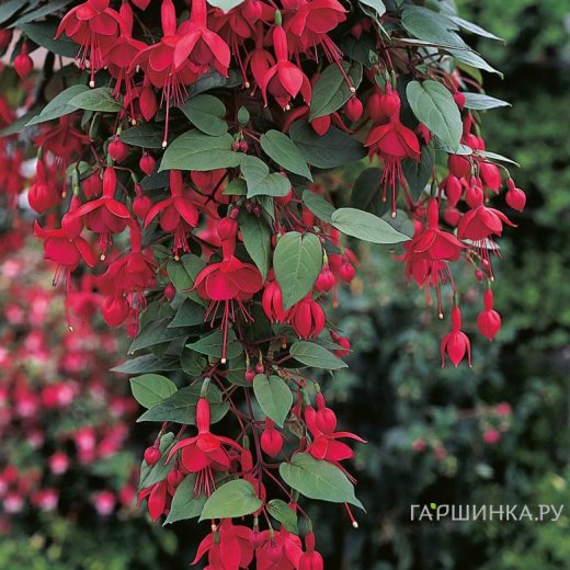 Фуксия Маринка - сорт ампельный. Цветение очень обильное, очень яркое, один из лучших. Фуксия – декоративный полукустарник, представитель семейства Кипрейных. Чашелистики ярко-красные, лепестки — большей частью простые, плотные, насыщенно-красно-малиновые. Растение представляет собой многоразветвленный стебель с очень красивыми цветами. Яркий свет или полутень, но без прямых солнечных лучей. Фуксия нуждается в хорошо дренируемой, легкой почве без застоя воды. Морозостойкость до -3-5°С.