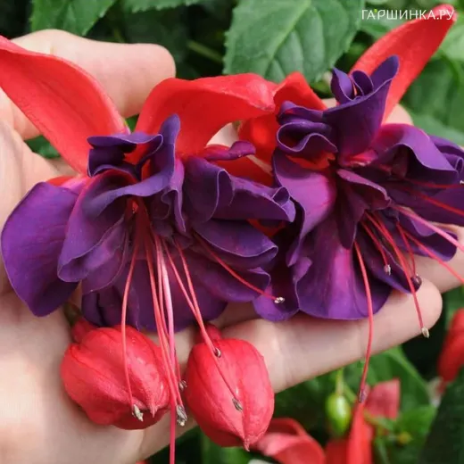 Фуксия Вуду - относится к кустовым растениям. Она образует мощный кустик, который может достигать высоты до 80 см. Побеги этого сорта быстро одревесневают, что придает растению особую прочность и стабильность. Цветение фуксии начинается в июне и продолжается до октября. Это ранний период цветения для данного вида растений. Фуксия славится обильным цветением – на ее побегах появляется большое количество бутонов, которые распускаются в яркие соцветия. Бутончики имеют форму сердечка, а чашелистики характеризуются насыщенно-красным цветом. Юбочка же имеет темно-сине-фиолетовую окраску с яркими красными мазками, что создает впечатление двухцветности. Основная окраска цветов этого сорта – красно-фиолетовая.