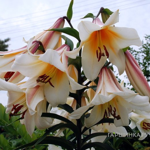 Лилия Гарден Эффейр ОТ-гибрид /2шт - высокорослый сорт с очень крупными белыми цветками. Высота: 160см. Цветок: белый с медово-жёлтым центром и тёмно-розовой полосой по тыльной стороне лепестка, диаметром до 25 см. На 3 год вырастает до 2,2 м и дает до 30 очень крупных соцветий. Период цветения: июль - август.