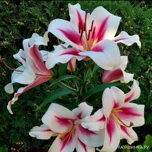 Лилия Гаучо ОТ-гибрид розовая Цветки крупные, диаметром 22 см, белые с малиновыми стрелками от центра. Имеет тонкий нежный аромат. Цветки направлены в сторону и вверх. Высота растения 120 см.  Цветет в июле-августе.