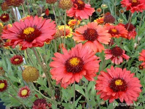 Гайлардия Бургундер - многолетнее растение, гибридный сорт, высотой до 50-60 см. Листья ланцентовидные, немного опушенные. Стебли ветвистые. Цветки гайлардии Burgunder (Бургундер) бордово-винного цвета с выпуклым центром коричнево-желтых оттенков, диаметр до 10 см. Цветет обильно в период с июня по август.
