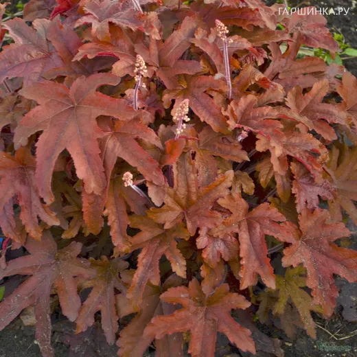 Гейхерелла Ред Ровер. Высота растения до 25-30 см, до 60 см в ширину. Уникальный сорт с очень резными листьями. На вид лист похож на руку с длинными пальцами. Цвет листочков – интенсивно-медно-красный с выделенной бордовой серединкой. Летом, когда температура повышается, будет становиться ближе к мягко-оливковому цвету. Цветет обильно сливочно-белыми колокольчиками на розовых цветоносах.