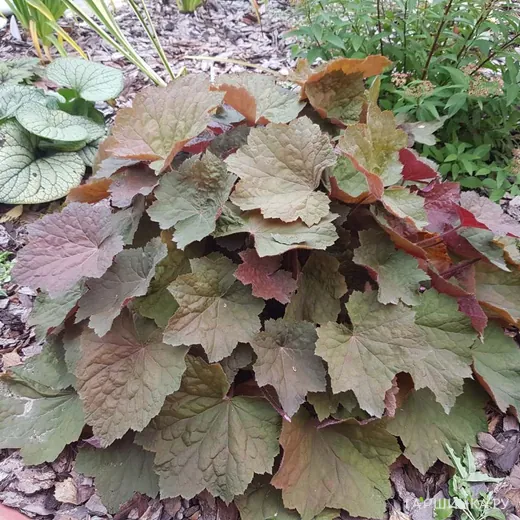Гейхера Биг Топ Бронз - это многолетнее травянистое растение, которое привлекает внимание своими декоративными качествами и неприхотливостью в уходе. Это растение относится к семейству Камнеломковые и является популярным выбором для создания живописных клумб и бордюров. Гейхера Биг Топ Бронз отличается компактным типом роста и образует плотные кустики высотой до 50 см. Ее побеги не имеют шипов и колючек, что делает растение безопасным для использования в садах и парках.