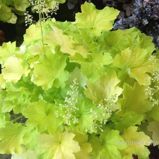 Гейхера Фисташ - многолетнее травянистое растение. Куст крупный, плотный высотой 40-60см, диаметром 60см. Разрастается быстро, необходимо деление куста каждые 3-5 лет. Декоративные свойства сохраняет в течение всего сезона. У гейхеры Фисташ– листья крупные, округлые, зеленовато-лимонно-желтого оттенка, немного похожи на резные дубовые. Листья покрыты маленькими волосками. Окраска листьев не меняется в течение всего сезона. В тени больше проявляется зеленый цвет. Цветочки крупнее, чем у других гейхер, белые, собранные в пушистые метельчатые соцветия на цветоносах до 30см возвышаются над шапкой листьев. Цветение в июле-сентябре.