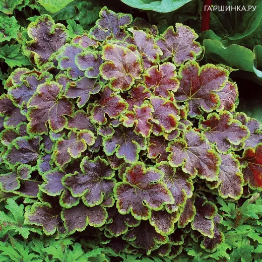 Гейхерелла Солар Эклипс. Высота растения 30см. Диаметр: 40см.Крупные округлые слаборассеченные темно-красно-коричневые листья с лимонно-зеленой каймой. Цветки белые. Цветет июнь-июль.