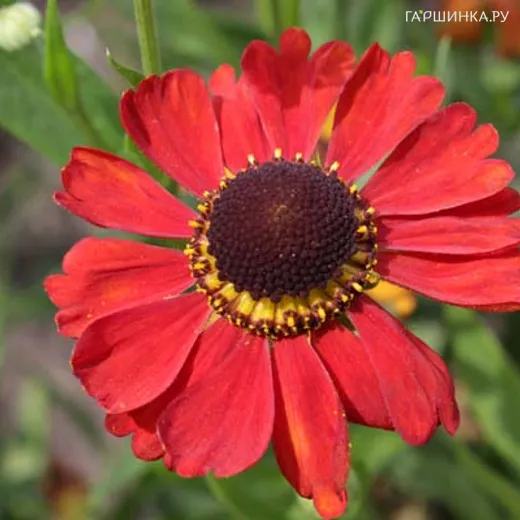 Гелениум Меранти – обильно и продолжительно цветущий осенний корневищный многолетник. Высота 80-90 см. Цветки диаметром 4-5 см, вначале жёлтые, затем с нерегулярными оранжево-красными оттенками. Центральный диск тёмно-коричневый. Цветение в июле-сентябре.