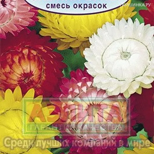 Эффектная смесь высокорослых (100 см) гелихризумов. Яркие махровые соцветия-корзинки Ø5-6 см с жесткими, пленчатыми лепестками традиционно используются в сухих букетах. Растения неприхотливые – холодостойкие, засухоустойчивые, практически не требуют ухода. Обильно цветут с июля по октябрь.