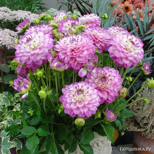 Георгина Мелоди Дикси бордюрная - растение бордюрное. Обильно цветущий, нарядный многолетник. Куст прямостоячий 0,6 м, соцветие шаровидное, 15 см , лепестки закручены в воронку. Окраска цветка нежно-лиловая, у основания бело-молочная. Цветет продолжительно и непрерывно до самых заморозков, декоративность высокая. Зона зимостойкости 8.