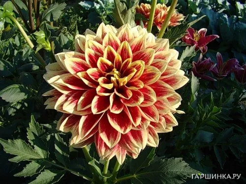 Георгина Кабальеро декоративная Яркие красные лепестки с нежно-желтыми кончиками создают крайне нарядный и праздничный вид цветку георгин Caballero. Цветет георгин шикарными густомахровыми цветками с расположенными в несколько слоев слегка заостренными лепестками.