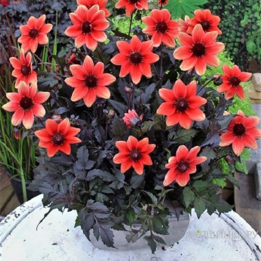 Георгина Драгон Белл деворативная - этот одноцветковый георгин действительно потрясающий. Красивые мягкие оранжевые лепестки в сочетании с темно-фиолетовыми листьями делают этот георгин особенным. Сердцевина внутри цветка темная. С июля по октябрь эти цветы будут сиять в вашем саду. Георгина вырастает примерно на 20-30 см в высоту и предпочитает полное солнце или полутень. Диаметр цветка около 5 см