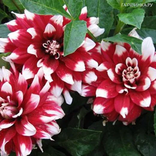 Георгина Дуэт декоративная Высота 100 см. Имеет густо махровые цветки с плоскими, широкими лепестками, закругленными на концах и слегка закрученными к стеблю. Цвет георгины - красный с белыми кончиками. Соцветия крупные, заметны издалека . Прекрасно подходит для одиночных посадок на фоне газона, хвойных изгородей или на заднем плане групповых посадок и цветников. Может использоваться на срезку.