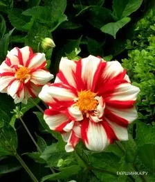 Георгина Файр энд Айс бордюрная Цветки белые с ярко-красными мазками на лепестках и желтой серединкой. Высота куста 60 см, диаметр до 90 см.