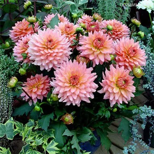 Георгина Геллери Леонардо бордюрная — бордюрное растение. Высота до 35 см. Зона зимостойкости 8. Цветки язычковые в корзинке 15 см, лососевого цвета. Каждый лепесток приподнят у середины, кончики закручиваются вверх. Цветение обильное.