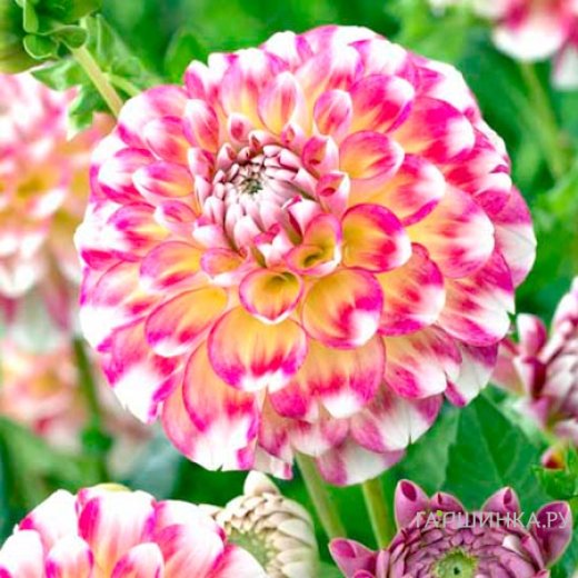 Георгина Гаваи шаровидная - лепестки сочетают в себе несколько насыщенных цветов: кончики лепестков имеют цвет ванили, лимонного цвета основание и малиновую кайму. Высота георгины 60-100 см. Цветок до 12 см в диаметре. Цветет продолжительное время - с июня до октября.