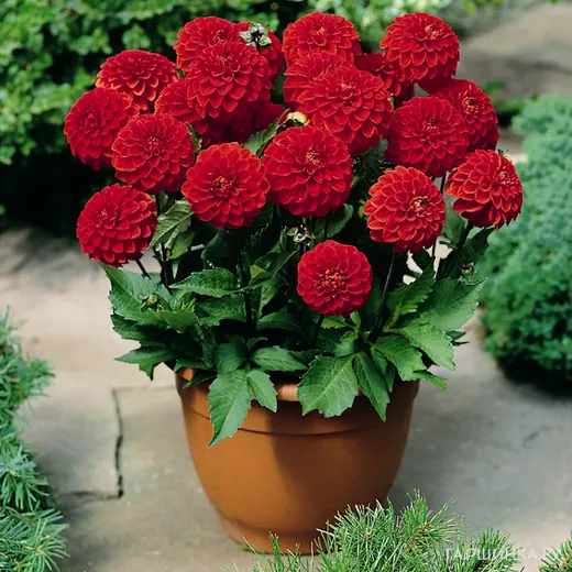 Георгина Хитвейв бордюрная — бордюрное растение. Цветки пышная корзина 13 см, алого цвета. Высота 40 см. Подходит для патио и выращивания в горшках. Цветение обильное и продолжительное. Зона зимостойкости 8.