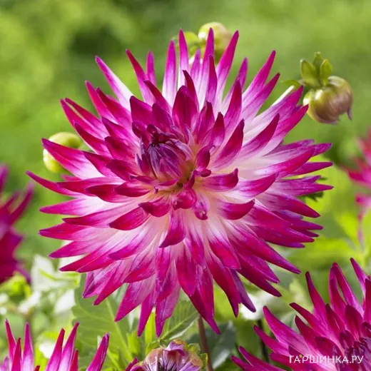Георгина Дач Эксплоужен (Голландский взрыв) кактусовидная- Очень яркий, нарядный сорт георгины. Образует куст высотой 90-120 см. Диаметр цветка 15-18 см. Бутоны образуются с июля и до заморозков. Цвет георгины - в центре светло-розовая к кончикам ярко-розовая.