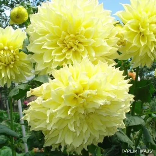 Георгина Кельвин Флудлайт (МАКСИ) декоративная - среднерослый сорт декоративных георгин, поражающий своими огромными неоново-желтыми соцветиями. Одна из самых популярных георгин в Европе и США. Высота: 90-110 см. Размер цветка: 18-20 см. Сорт выведен в Австралии в 1959 году.