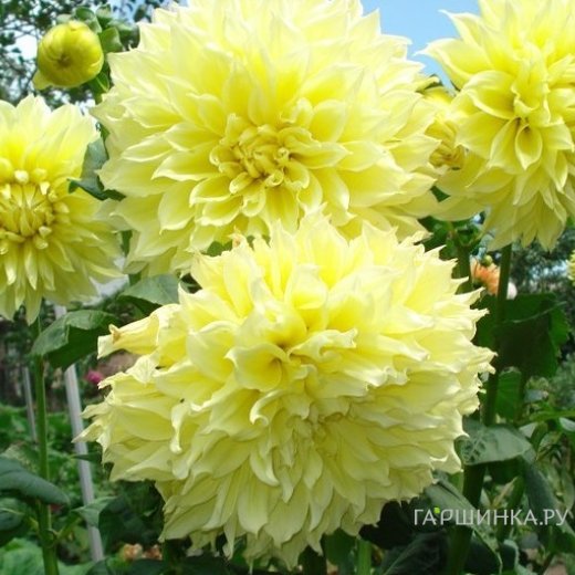 Георгина Кельвин Флудлайт (МАКСИ) декоративная - среднерослый сорт декоративных георгин, поражающий своими огромными неоново-желтыми соцветиями. Одна из самых популярных георгин в Европе и США. Высота: 90-110 см. Размер цветка: 18-20 см. Сорт выведен в Австралии в 1959 году.