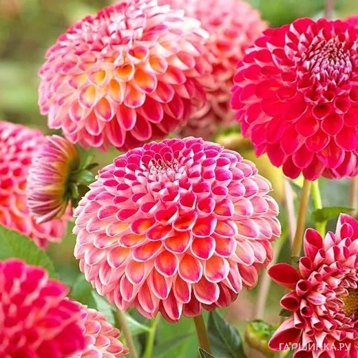 Георгина Кенора Файербол шаровидная - Цвет лепестков у основания желтоватый, переходящий, как хамелеон от ярко-розового до кирпично-красного. Высота георгины 100 см. Цветок 10 см в диаметре. Цветет продолжительное время с июня до октября.