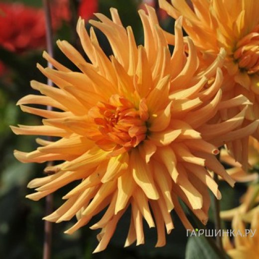 Георгина Людвиг Хелферт кактусовидная - Классическая кактусовидная георгина с гигантскими насыщенно оранжевыми соцветиями. Образует куст высотой 100 см. Цветы георгины достигают 15-18 см.  Цветет в период с июля по сентябрь.