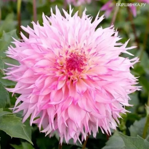 Георгина Надя Рут (МАКСИ) бахромчатая - многолетник, формирующий травянистый куст высотой 90-120 см при выращивании в открытом грунте и до 140 см при размещении георгины в теплице. Листва гладкая, темно-зеленая, среднего размера. Соцветие шаровидное, махровое, достигает в диаметре 20-23 см. Окраска бутона бело-розовая, градиентная. Лепестки у основания белые, к кончикам розовый оттенок ярче и гуще. Период цветения июль-октябрь. Яркого аромата цветок не имеет.