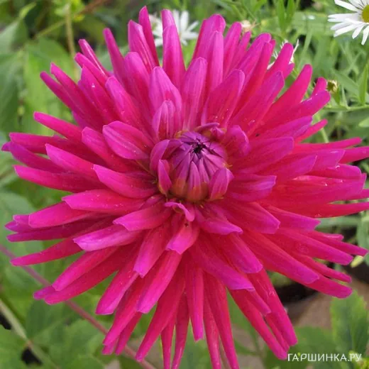 Георгина Орфео кактусовидная - крупные плотные цветы с лепестками цвета фуксии. Сорт образует куст высотой 120 см. Цветы достигают 15-20 см. Цветет в период с июля по октябрь.