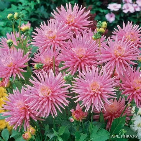 Георгина Парк Принцесс бордюрная - низкорослый сорт кактусовых георгин, радующий своими розовыми соцветиями. Цветет эта георгина обильно с июля и до самых заморозков. Высота: 40-60 см. Размер цветка: 10 см.