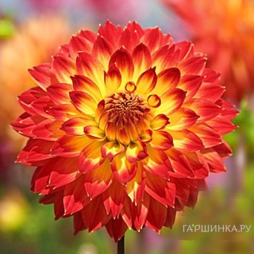 Георгина Процион декоративная отличается очень яркими, пышными соцветиями. Рассеченные на кончиках, лепестки собраны в густой шар. Оранжево-желтые лепестки украшены красными пятнышками на кончиках. Декоративная георгина Procyon порадует Вас долгим обильным цветением с июня по октябрь. Диаметр цветка при роспуске 10-15 см. Высота растения: 110 см.