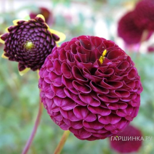 Георгина Рокко помпонная - группа помпонных георгин. Куст прямостоячий, формируется легко, высота 0,9м, ширина 0,6 м. Соцветия 6 см, миниатюрные, лепестки атласные, язычковые, закручены в трубочку, верхушка тупая, закругленная. Окраска цветка лиловая, с розовым отливом. Лист блестящий, овальный, зеленый. Сорт устойчив к дождю, цветет продолжительно. Зона зимостойкости 8.