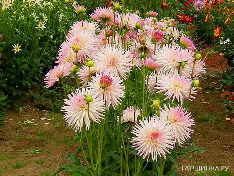 Георгина Старс Леди бордюрная. Эта очаровательная и элегантная георгина просто создана украсить бордюры на Вашем садовом участке. Период цветения приходится с июля по октябрь, расцветая крупными плотными цветами сливочного оттенка с нежно-розовым отливом по кончикам закрученных в трубочку, нежных лепестков. В роспуске соцветие диаметром 10-15 см, с тонким чарующим ароматом. Очень обильное и продолжительное цветение этого сорта георгин несомненно вызовет у вас восторг. Высота - 60 см, стебли прочные не требуют подвязывания к опоре, листья темно-зеленого оттенка.
