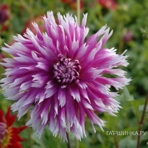 Георгина Тэйбл Данс бахромчатая Куст компактный, ветвистый, стебли прочные, полые высотой 90 см. Листья перистые темно-зеленые, многочисленные. Соцветие махровое, фиолетовое с белыми кончиками, диаметром 15 см. Лепестки свернуты в трубочки с сильно рассеченными кончиками.