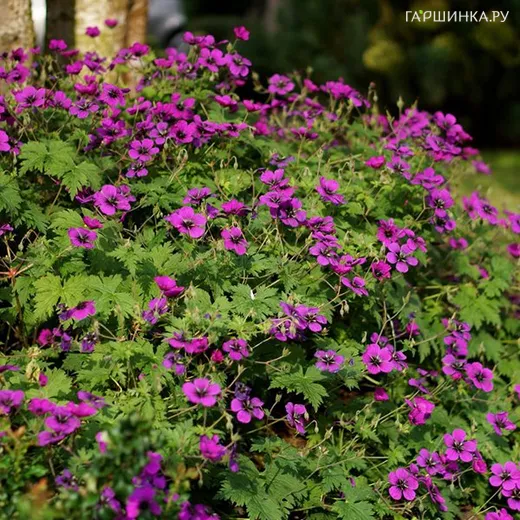 Герань Дрэгон Харт – эффектный почвопокровный неприхотливый многолетник. Высота около 30 см и около метра в ширину. Темно - зеленые крупные листья разделены на 5 - 7 долей. Длинные цветоносы полегают, но если есть опора – взбираются по ней. Пурпурные цветки крупные 4 - 5 см в диаметре с черными прожилками, которые сливаются в центре в черный глаз. Цветет с июня до осени.