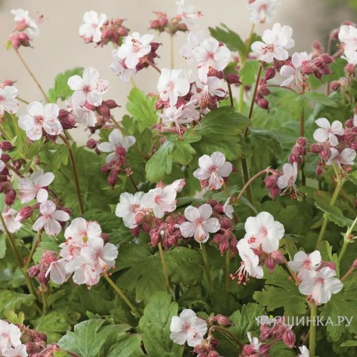 Герань Шпессарт крупнокорневищная – эффектный почвопокровный неприхотливый многолетник. Максимальная высота взрослого растения – 25 см, а ширина - 50 см. Цветки небольшие, бело-розовые. Диаметр - около 3 см. Цветение длится с начала июня до начала сентября.