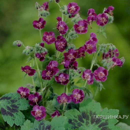 Герань темная Самобор имеет компактную форму роста, достигая высоты до 40-60 см. Ее побеги густо покрыты листьями, которые обладают уникальной темно-зеленой окраской с характерными пурпурными пятнами, что придает растению особую декоративность. Листья имеют округлую форму и зубчатые края, создавая плотную крону. Цветы герани темной Самобор мелкие, но многочисленные, с яркими фиолетовыми лепестками, собранными в соцветия. Период цветения длится с мая по июль, что позволяет наслаждаться красотой растения на протяжении всего лета.