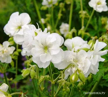 Герань садовая Лаура – эффектный почвопокровный неприхотливый многолетник. Высота 60 см. Цветки диаметром 4 см махровые белые с желтым центром. Листья темно- зеленого цвета. Период цветения июнь- август.