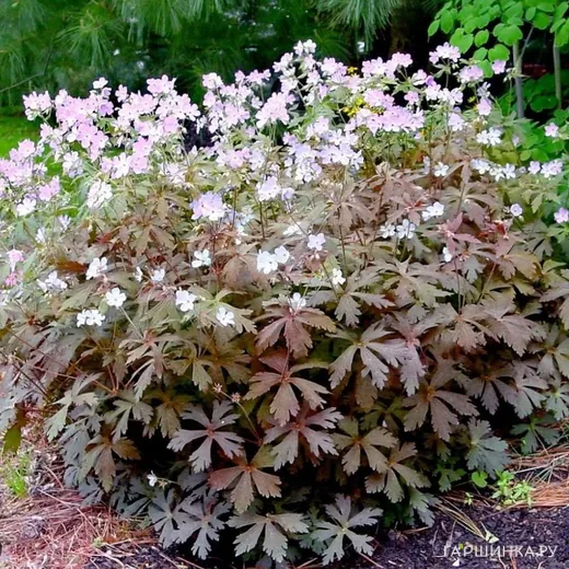 Герань пятнистая Эспрессо - имеет аккуратный кустик округлой формы. Сорт "Эспрессо" интересен прежде всего окраской листвы: шоколадного насыщенного цвета, которая осенью становится золотистой. Высота взрослого растения: 40 см. Цветение: июнь-июль. Цветет обильно розово-сиреневыми цветами, в начале осени часто цветет повторно.