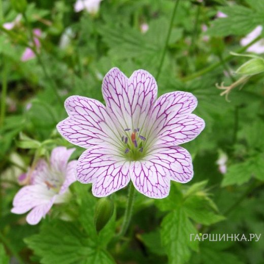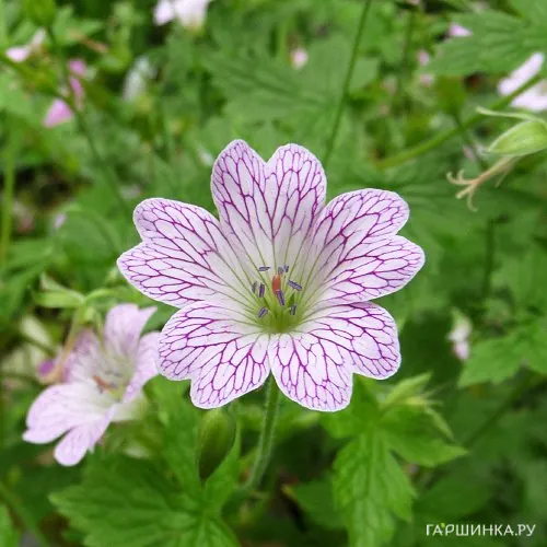 Герань садовая Лэйс Тайм – эффектный почвопокровный неприхотливый многолетник. Высота 60 см. Курганообразующий вечнозеленый многолетник с лопастными, морщинистыми, средне - зелеными листьями и с поздней весны до конца лета бледно - розовыми цветами с темно - пурпурно - розовыми прожилками.