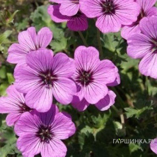 Герань садовая Сатин – эффектный почвопокровный неприхотливый многолетник. Высота 25 см. Цветки диаметром 2 - 2,5см.Цветки сиренево - розовые с темной серединкой. Период цветения июнь - сентябрь.