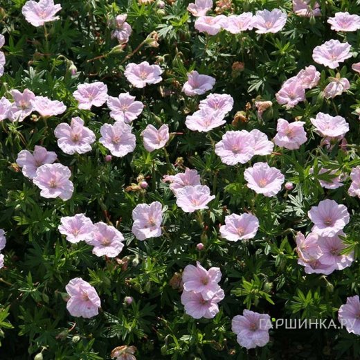 Герань кроваво-красная Апфельблют – эффектный почвопокровный неприхотливый многолетник. Максимальная высота взрослого растения – 20 см. Цветки нежно-розовые с розовыми прожилками, которые, ветвясь, идут от центра. Цветение длится с начала июня до начала сентября.