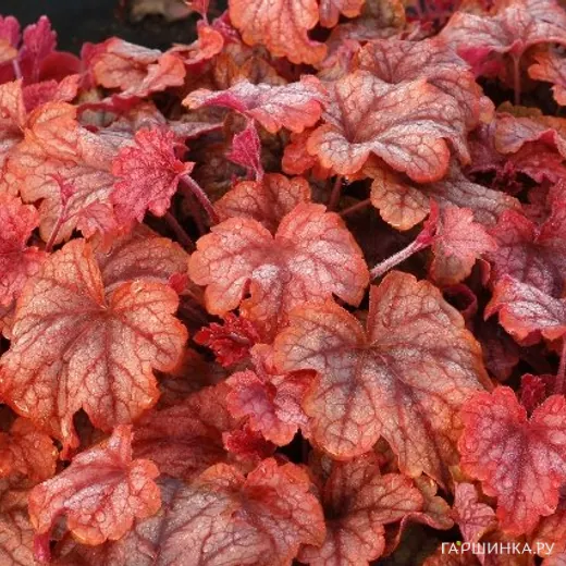 Гейхерелла Купер каскад. Ширина: 40 см. Высота: 30 см. Окраска листьев сочетает медно-золотые и кораллово-розовые оттенки. Листва держит свой цвет круглый год. Цветок: белый. Цветет июнь.
