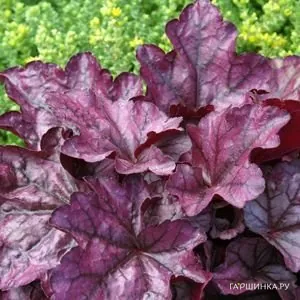Гейхера Плам Рояль. Высота растения 20-25см., диаметр 30-45см. Первая гейхера с удивительно блестящим фиолетовым цветом, который сохраняется все лето. Белые цветы отлично контрастируют с темными листьями. К концу сезона цвет листьев становится глянцевым черно-фиолетовым. Цветет май-июнь.
