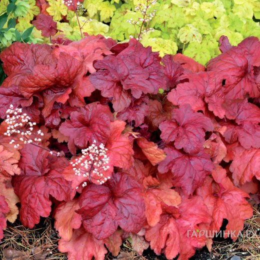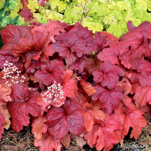 Гейхера Фаер Чиф. Высота около 25 см, диаметр 30 см., высота цветоноса 45 см. Великолепный и компактный куст с немного гофрированными листьями винно-красного цвета. Цветки маленькие, белые и розовые. Цветет долго, с мая по октябрь.