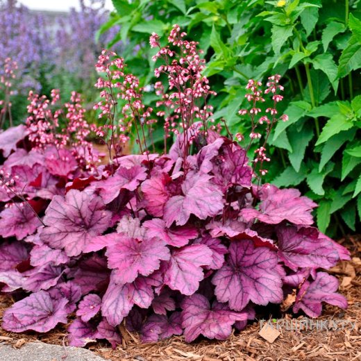 Гейхера Форевер Пепл. Высота: 30см. Диаметр: 55см. Эффектный яркий сорт с крупными, резными, пурпурно-фиолетовыми листьями. Цветки на коротких цветоносах нежно-розового оттенка. Время цветения: июль - август.