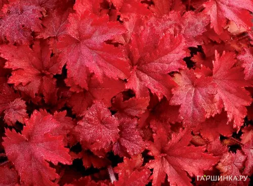 Гейхера Форевер Peд. Выcота 30 см, ширина 30 см. второе название "всегда красная". Корневищный, травянистый многолетник, активного роста. Куст густой, плотный, формируется быстро, легко, Окраска цветка белая, цветонос высокий. Лист плотный, резной, курчавый, глянцевый, ярко-ярко-ярко-красная-красная, прожилки не выраженные, ярко блестит на солнце.
