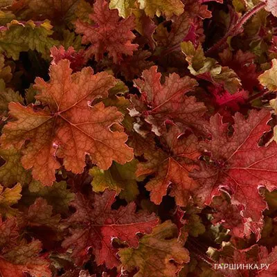 Гейхера Джинжер Пич. Высота около 25 см, диаметр 50-60 см., высота цветоносов до 50 см. Имеет резные, гофрированные листья с преобладанием оранжево-красных тонов. На протяжении всего периода роста происходит переход тонов: персиковый, коралловый. рыжий, медный. Цветки маленькие, белые. Цветёт июнь-июль.