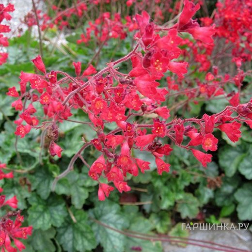 Гейхера Лючкафер. Высота 0,2 м, ширина 0,3 м, цветонос высокий , цветки розово-красные. Листья плотные, кленовидные, закругленные, лопастные, глянцевые, нарядные , зеленые, есть серебристый узор.