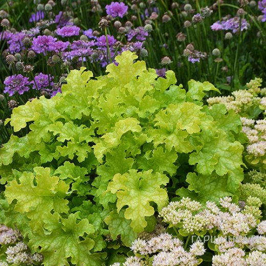 Гейхера Лайм Раффлз - сорт, который будет радовать глаз продолжительное время. Листья некрупные, гофрированные, лаймово-желтого оттенка. Летом цвет меняется на ярко-лимонный. Высота около 20-25 см, диаметр до 35 см., высота соцветия до 45 см. Цветки белые. Цветет гейхера Lime ruffles (Лайм Раффлс) с мая по июнь. Зона зимостойкости: 4 (-35 ° С).