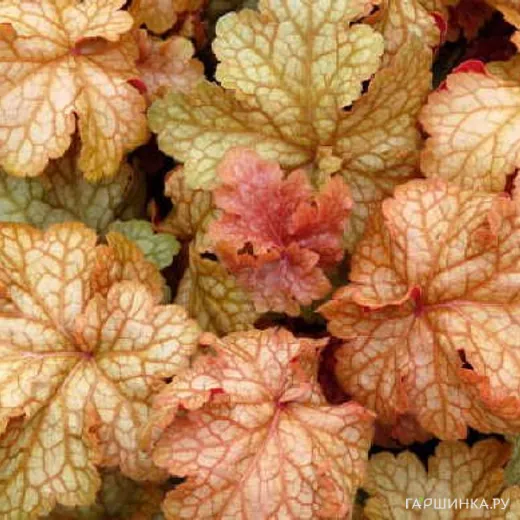 Гейхера Мидас Тач - Высота растения 35см., диаметр 35см. Уникальное компактное растение с крупными, не очень глубоко разрезанными листьями, вытянутой формы, покрытыми ворсинками. Цвет золотой с оранжевым, красноватым, зеленоватым – как ковер из осенних листьев, не меняет окраску. Цветки светло-розовые. Время цветения: июнь-август.